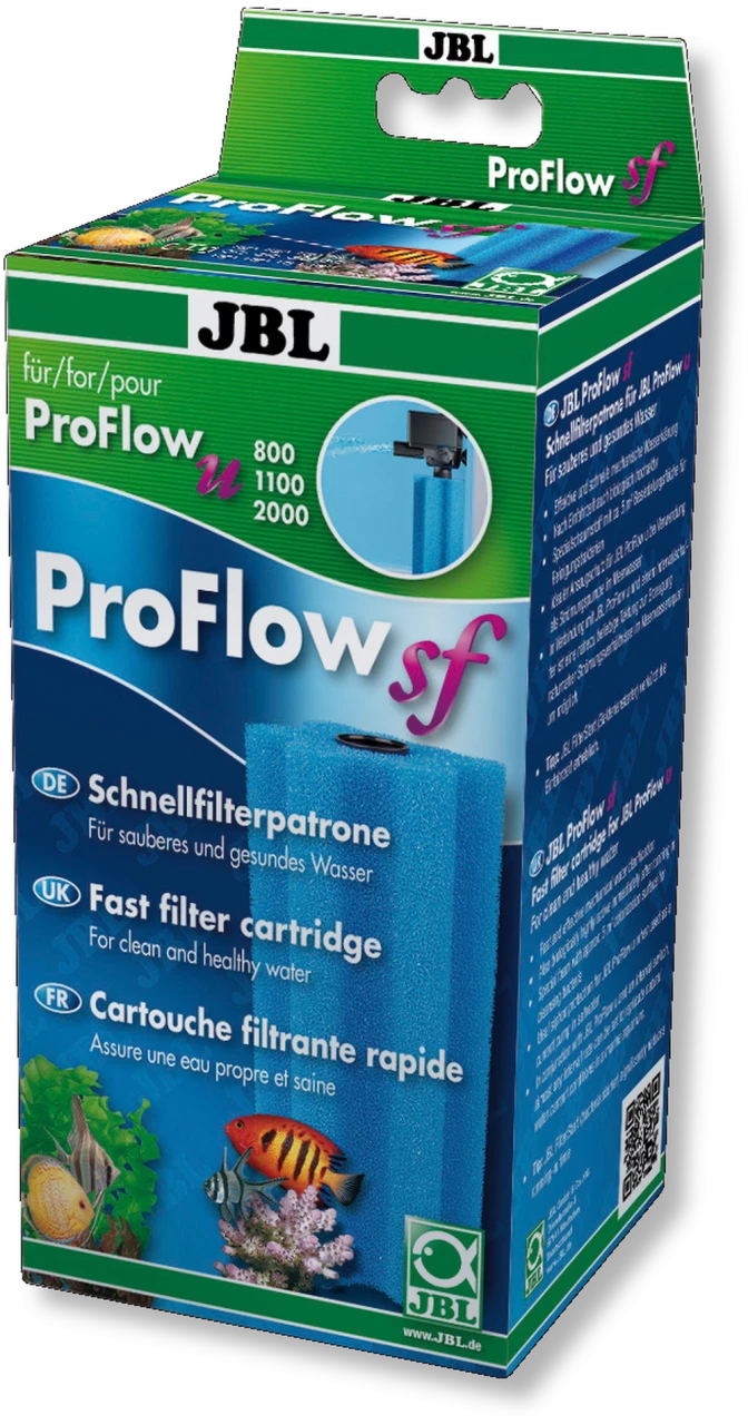 – protective function: If the JBL ProFlow pump is used in the aquarium, e.g. as a flow pump, it has a strainer on the intake. This could be too coarse for young fish or very small shrimp. With the foam cartridge, the suction is distributed over a larger area and even the smallest animals cannot be sucked in